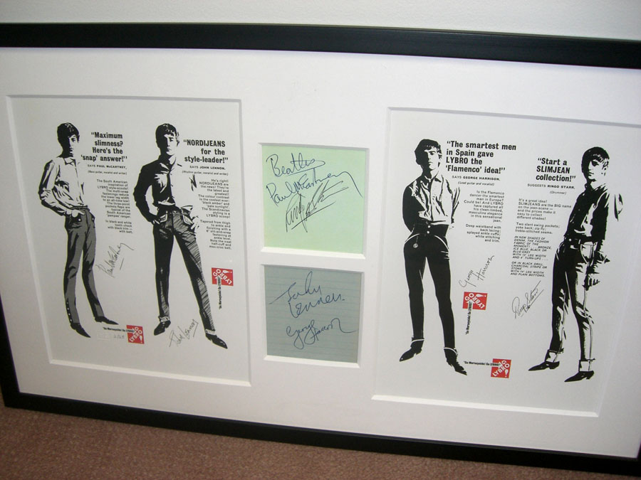 Paul has written “Beatles” above his signature, which is very desirable and adds a nice touch. Both pages, which are unmatted, were signed in late 1963. All four signatures are excellent examples from this period just before The Beatles arrived here for their first historic U.S. visit. Beautifully presented, it is professionally framed with a reproduction of the classic Beatles ‘Lybro’ Jeans advertisement and ready for display….. SOLD