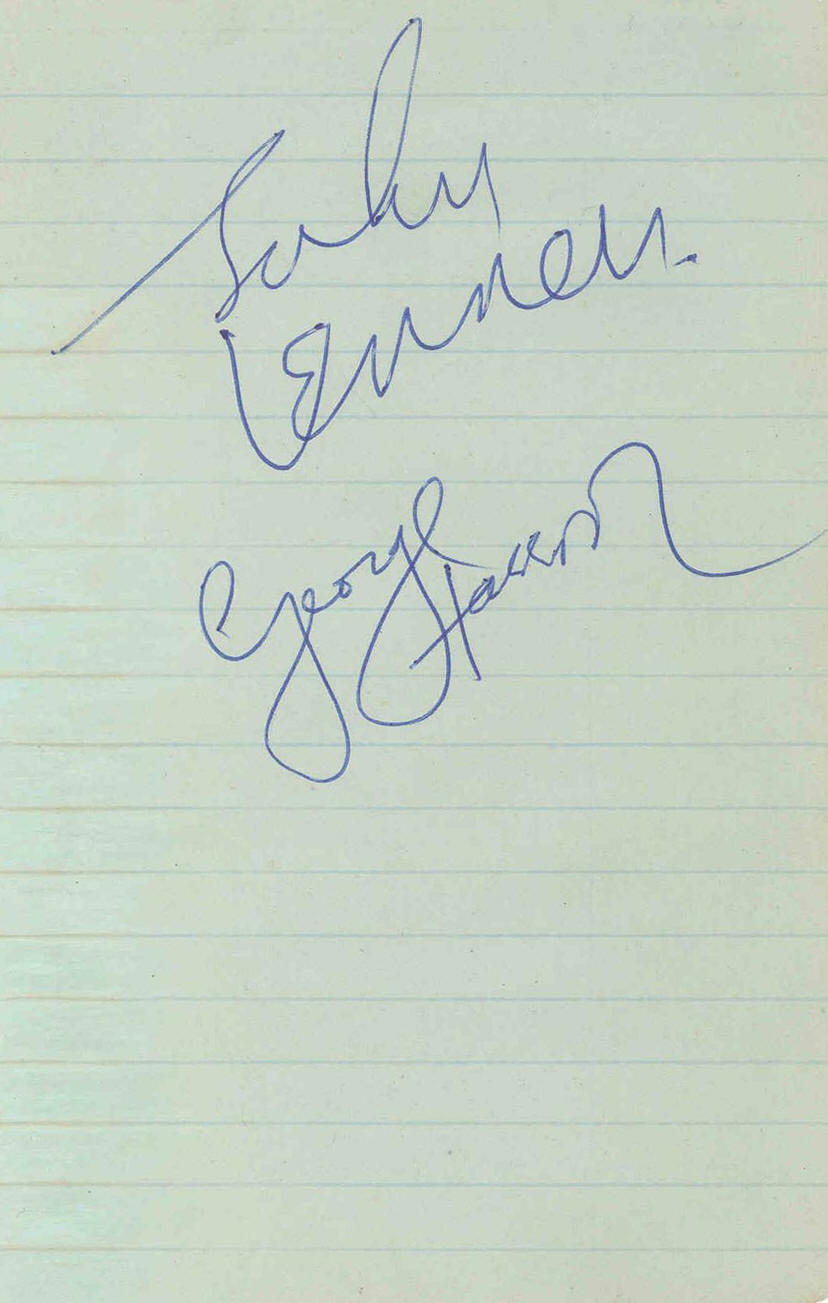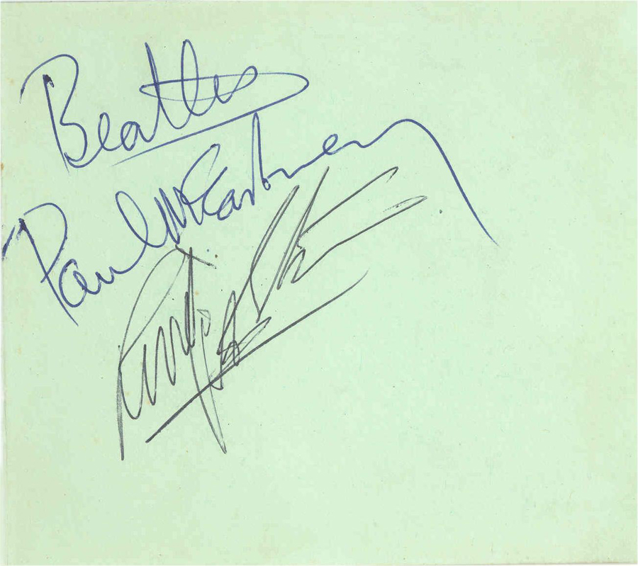 This complete set of Beatles signatures is contained on two pages, the first of which is a blue/green colored sheet of lined notepaper which measures 3 ¾” x 6”. John Lennon and George Harrison have signed this page beautifully in blue ballpoint pen. The second page measures 4 ½” x 4”, is light green in color, and has been signed by Paul McCartney in blue ballpoint pen, while Ringo Starr has used a black ballpoint.