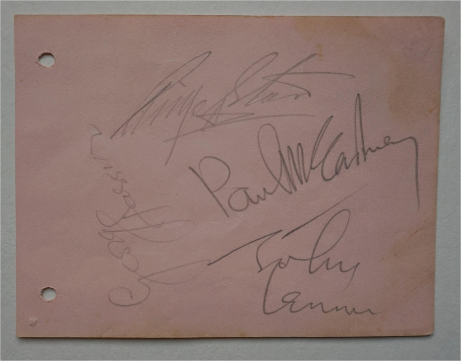 For many collectors, it’s a dream to own a full set of Beatles autographs on one item, signed by the band at the same time. However, with the rising rate of appreciation over years, many found that it was getting increasingly difficult to obtain that set of Beatles autographs. For such a collector, here is a more affordable full set of signatures on a pink colored autograph album page on which The Beatles have all autographed in pencil.