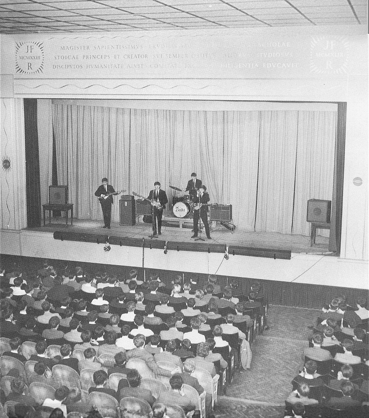 Here is one of these scarce and desirable promo cards, this one signed beautifully on the back by all four members of The Beatles in vibrant blue ballpoint pen, while performing live in concert at the Stowe School in Buckinghamshire, England. The show took place on April 4, 1963 in the Roxburgh Hall at the Stowe School, which was a prestigious all-boys public school, therefore the entire audience was made-up entirely of teenage males. With that, the audience was very quiet while The Beatles played, without a single scream to be heard. This concert came about after student David Moores from Liverpool had contacted manager Brian Epstein in January 1963 to see if The Beatles would consider performing at the school, and Brian thought it was actually a great idea and he agreed to do it, for the sum total of £100.