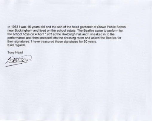 This scarce signed Parlophone card measures 5 3/4″ x 3 1/2″, and it is in impeccable condition, having been very well kept for the past 60 years. It was obtained by the 16 year old son of the head gardener at the school, who lived on the grounds and attended the concert, and was able to get into the dressing room – where he got them to sign this promo card. His written account of this is included. The condition of this signed promo card is such that, if you were standing outside of the dressing room on the day it was signed, and you were handed it as the original obtainor was leaving the room – this is exactly what you would have in your hands! It couldn’t have been any better kept and it is arguably the nicest Beatles signed Parlophone promo card in existence…..SOLD