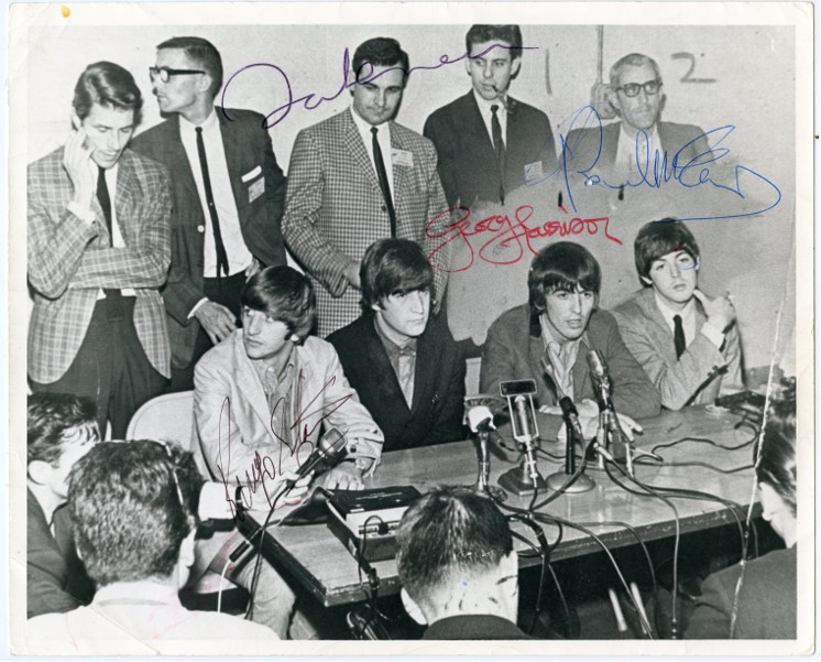 This one-of-a-kind Beatles signed rarity is a 10″ x 8″ black and white photograph features a shot of the Beatles with microphones in front of them and reporter surrounding them at a press conference just prior to their performance at Cincinnati in Ohio on August 27, 1964. Directly behind the Beatles are four DJs From the radio station WSAI-AM and to the far left is pictured Beatles publicist Derek Taylor. Complete Beatles autograph sets from the solo era are as rare as rare can be. There were not many in-person graph obtainors in the 1970s who would have had the ability to get all four on separate occasions and separate locations – but there was one. His name was Howard Siegel. Howard was a huge Beatles fan and photographer from Cincinnati, was without question one of the pioneers of in person autograph obtaining, who while an untrained photographer, got many good candid shots of bands and artists such as the Beatles, Elvis Presley, Led Zeppelin, The Rolling Stones, the Who, Bruce Springsteen, and others. Of these, he pursued getting The Beatles to sign for him on several occasions.