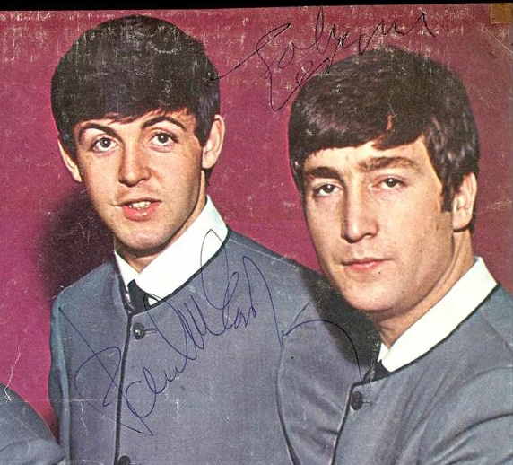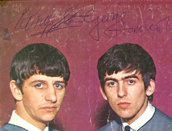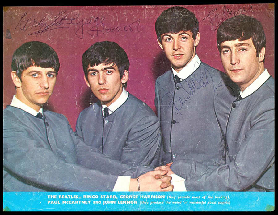 Authentic signed photos of The Beatles are a rare commodity, especially color images like this one. Carefully removed from an early British fan magazine, this photo measures 11 ¾” x 9” and features an image of the group in their light gray collarless suits as photographed by the legendary Dezo Hoffmann in mid-1963. All signatures date from August/September 1963 and each Beatle has signed in blue ballpoint pen above or on his respective image. The page is in good condition, with some scuffing to the maroon photo background, minor creasing and small tape stains in the lower left- and right-hand corners. When you consider that fewer than 20 fully-signed color images of The Beatles have surfaced to date, you begin to grasp the extreme scarcity of this item.
