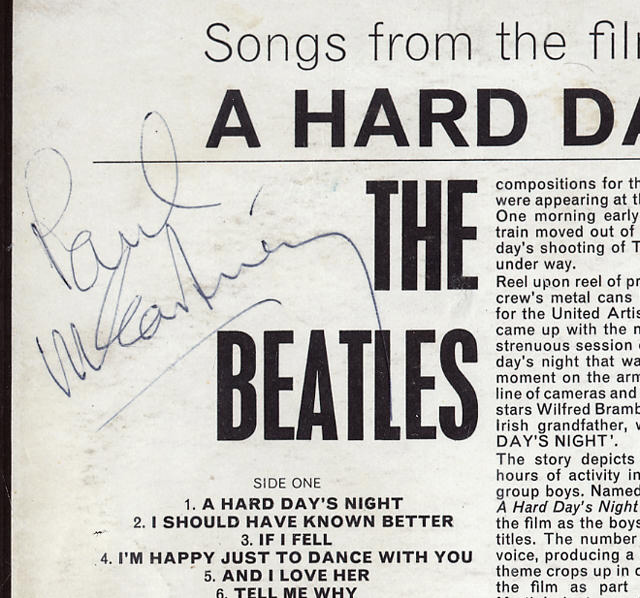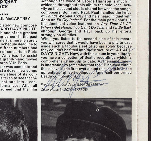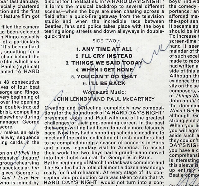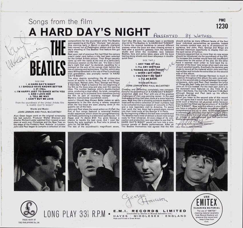 “A Hard Day’s Night” is the first U.K. issue Beatles album to feature photographs of the band members, with four individual headshots taken during the filming of the movie – and these images dramatically heighten the visual appeal of this signed Beatles treasure.