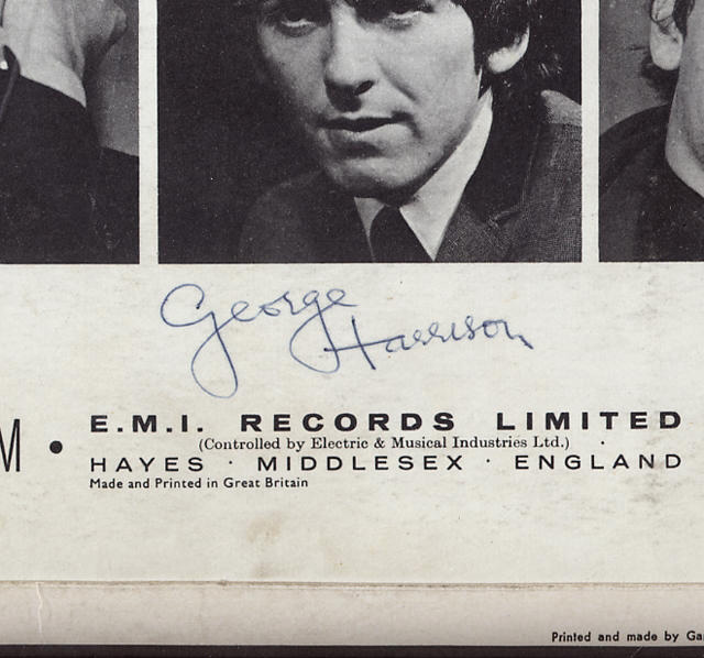 All four have autographed the back cover on this LP jacket beautifully in blue ballpoint pen, with John Lennon signing directly over the Side Two song titles, and Paul McCartney signing to the left of thick block capital letters stating “THE BEATLES”. George Harrison and Ringo Starr have signed below and above their respective images. This particular cover was the first prize in a contest held by Wathes, a store located in Liverpool, and in fact writing in another hand indicates that it was ‘PRESENTED BY WATHES’ to the winner. This well preserved album cover is in excellent condition, having been well kept over the years.