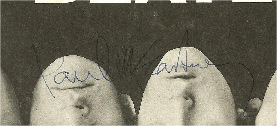Here is that fanzine, signed by the band just moments before they were to perform what is widely considered to be not only their most memorable concert ever, but arguably the single most famous concert of the past fifty years. All four have signed the front cover of the book very nicely in blue ballpoint pen. George Harrison has signed directly over his face, Ringo Starr has signed just under his chin, John Lennon has signed in his hair and Paul McCartney has signed just under the word ‘BEATLES’. Being a dark cover, the contrast is not ideal, but the signatures do show up well despite the fact that some are in dark areas. The book measures 8” x 10”, and is in very good condition overall.