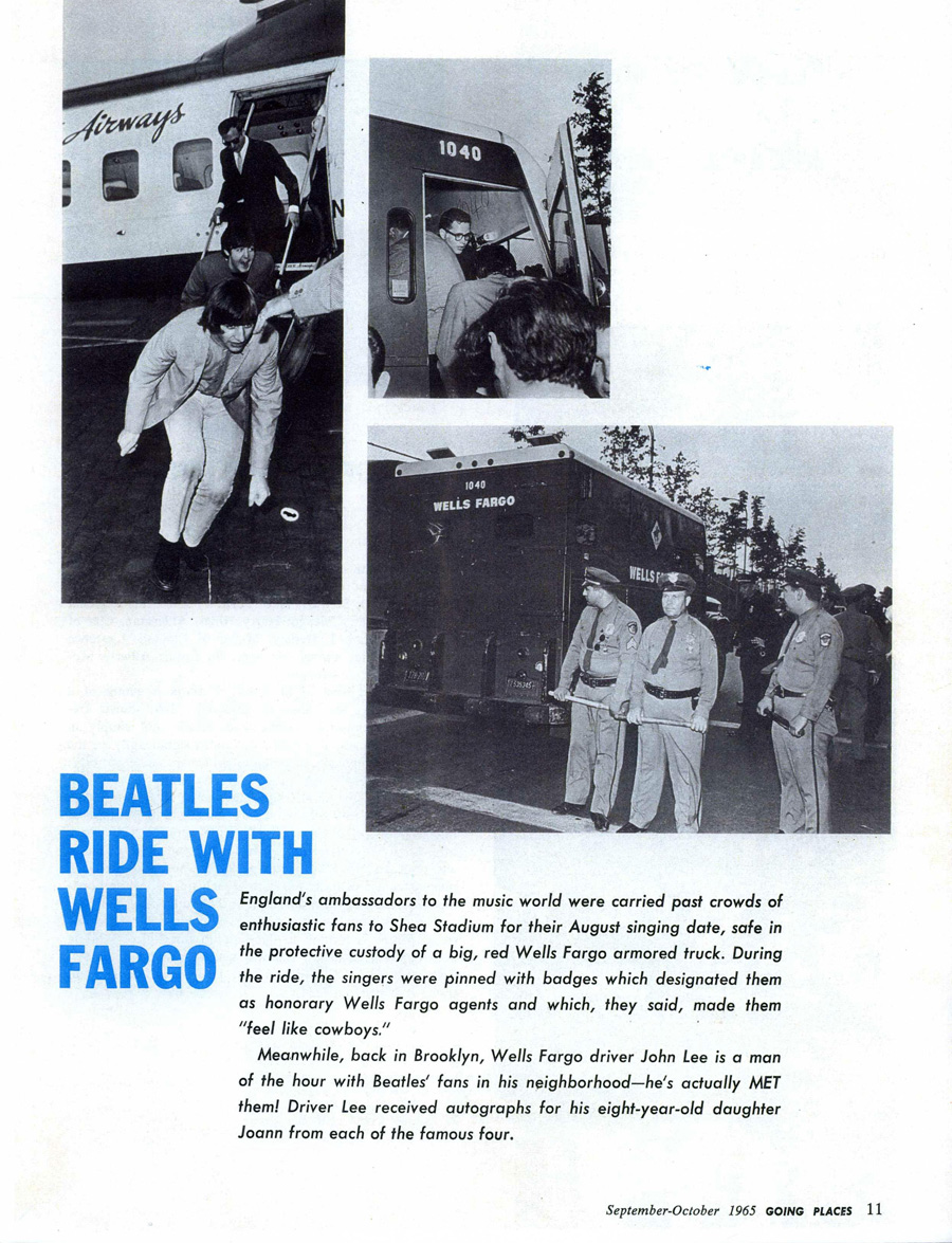 Each member of the band was given a Wells Fargo agent badge, which they later pinned to their stage jackets and wore throughout the entire show. The driver of the truck that day was Mr. John Lee, a Wells Fargo employee who had an eight year old daughter named Joann. Mr. Lee had known in advance what his assignment would be that day, so he took along one of his daughter’s Beatles fan magazines with the idea of getting the group to sign it. When he returned home that night, he presented Joann with the magazine, signed for her by all four Beatles!