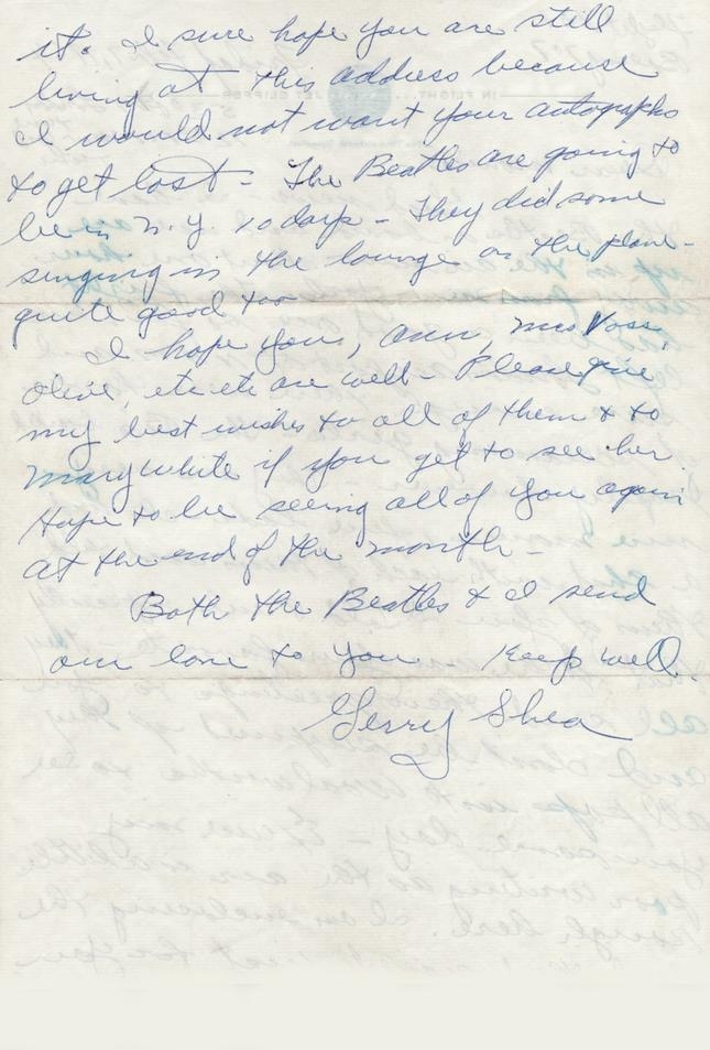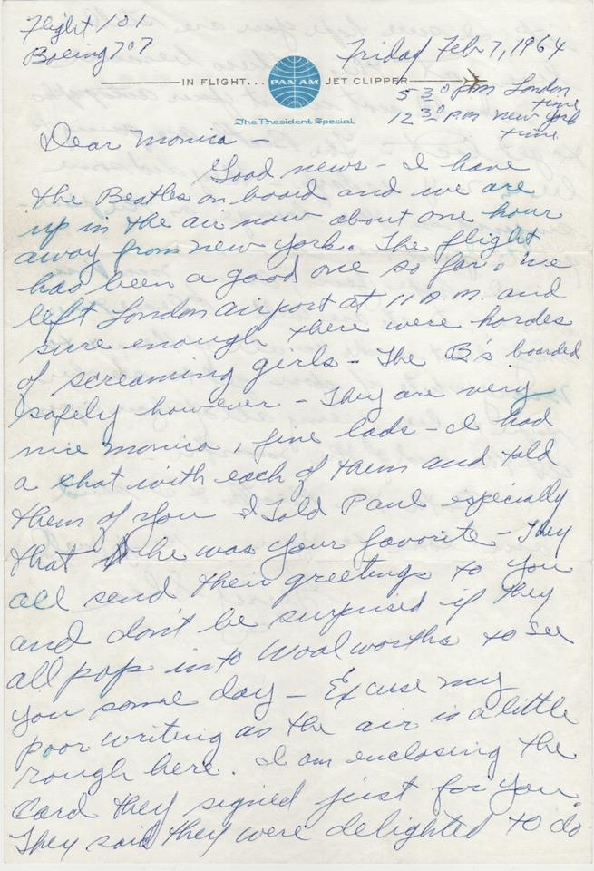 Good news – I have the Beatles on board and we are up in the air now about one hour away from New York. The flight has been a good one so far. We left London airport at 1 a.m. and sure enough there were hordes of screaming girls – The B’s boarded safely however – They are very nice Monica, fine lads – I had a chat with each of them and told them of you – I told Paul especially that he was your favorite – They all send their greetings to you and don’t be surprised if they all pop into Woolworths to see you someday – Excuse my poor writing as the air is a little rough here. I am enclosing the card they signed just for you. They said they were delighted to do it. I sure hope you are still living at this address because I would not want your autographs to get lost – The Beatles are going to be in N.Y. 10 days – They did some singing in the lounge on the plane – quite good too. I hope you, Ann, Mrs. Voss, Olive, etc. etc. are well – Please give my best wishes to all of them & to Mary White if you get to see her. Hope to be seeing all of you again at the end of the month – Both the Beatles & I send our love to you – Keep well