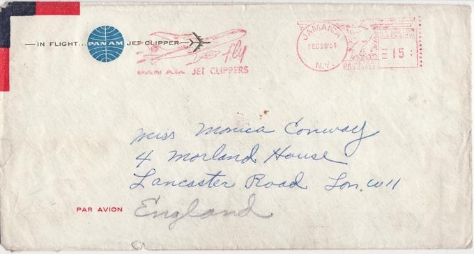The postcard and letter are accompanied by the original Pan Am envelope which has been addressed to the recipient in London, Monica Conway, and is postmarked “FEB10 ‘64” (mailed from Jamaica, New York – which is just next to JFK airport).