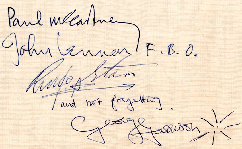 McCartney then signed his full name, followed by the other three Beatles – John Lennon (who has added “F.B.O.” following his signature), Ringo Starr and finally, George Harrison, who has written “and not forgetting” before his signature, and a star-burst symbol afterwards. The “J” used by John is a ‘throwback’ to the style of “J” that was last seen in early 1963 – some 3 ½ years prior. All four of the signatures on this letter are perfect; they are excellent and complete examples, and are as nicely as they could have signed on that day. Additionally, McCartney has written “ESQUIRE” following his printed name in the letterhead.