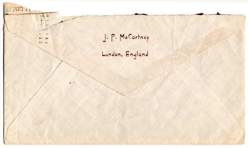 This envelope is postmarked from Cincinnati, Ohio on August 21, 1966, the exact mid-point of the tour. Affixed is the required 5 cent postage, in the form of a blue tinted George Washington stamp. On the reverse are the printed words “J.P. McCartney, London, England”, the font being an exact match to that on the stationary – therefore making this the proper accompanying envelope!