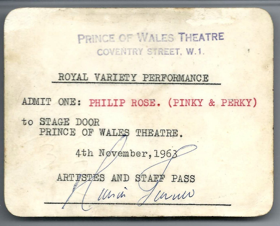 All four have autographed the back of this artistes and staff pass very nicely in black ballpoint pen, with Paul McCartney adding “Beatles” above his signature. This pass, which measures 4 ½” x 3 ½”, was given at the door to Philip Rose from the weekly half hour television show “Pinky and Perky” (who were actually marionette pigs). The show appeared on BBC television and Philip Rose was a manipulator of one of the puppets, and also a wise man to have his pass autographed by The Beatles that evening.