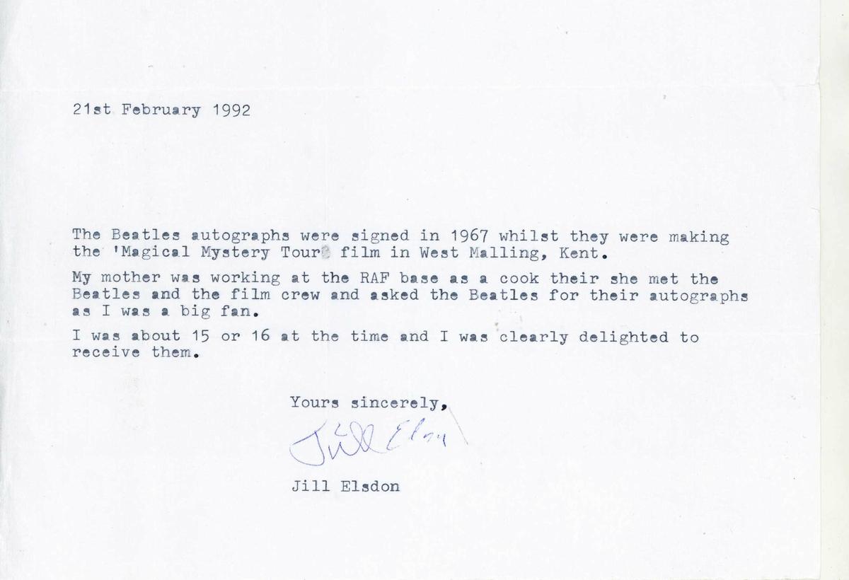 These signatures were obtained by a female cook who worked at the RAF base who had the opportunity to get The Beatles autographs for her daughter. It comes with a signed note from the girl, Jill Elsdon. Autograph sets from this late in The Beatles’ career are quite desirable because they had all but stopped signing for fans after their breakthrough in America three and a half years earlier. In recent years, Beatles autograph sets from the year 1967 have literally dried up and seldom appear anywhere for sale. The set, which has a light horizontal crease across the center and a few small marks, could appropriately be framed with one of the photos contained within the “Magical Mystery Tour” LP booklet. The larger of these images (12” x 24”) features The Beatles in full stride during the amazing “I Am The Walrus” video shoot.