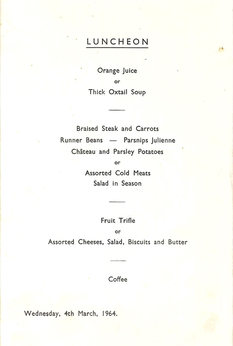 Lunch was served on the train and here is a luncheon menu from that very day that gave the diner various choices for a starter, main course, dessert and coffee. All four have autographed the back of this menu beautifully using a blue ballpoint pen. The menu, which measures 4 1/2″ x 6 1/2″, is in excellent condition, having been well kept over the years.